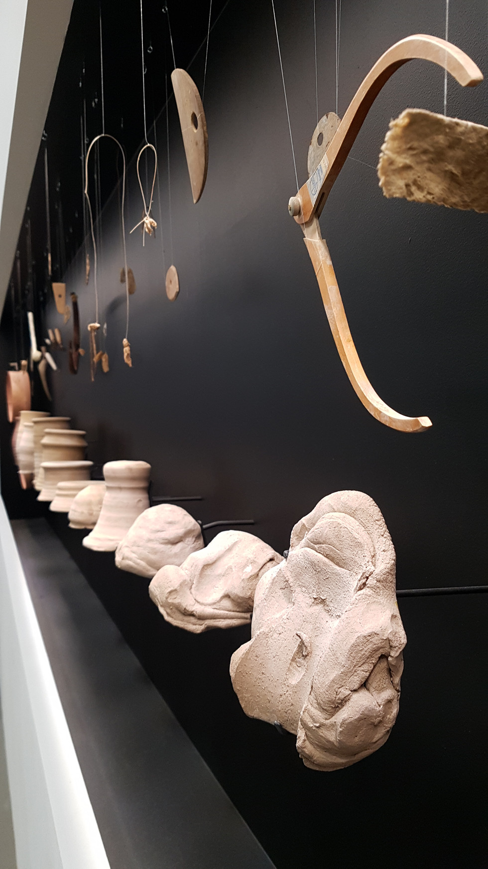 Dans la scénographie de l'exposition "Les Flammes - l'âge de la céramique" - Musée d'Art Moderne de Paris - on démarre sa déambulation par des outils suspendus.